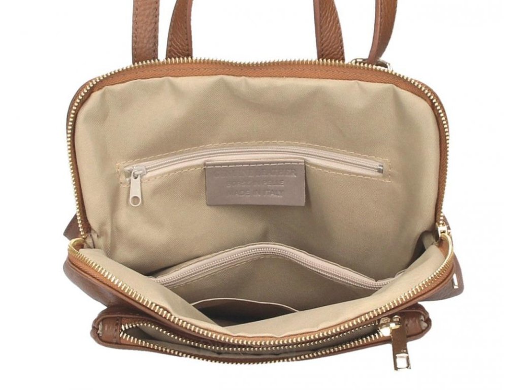 Pokud toužíte po kvalitním dámském batůžku z pravé kůže , potom by se Vám mohl líbit tento italský krasavec. Batůžek je vyrobený z přírodní měkké kůže. Můžete ho nosit na zádech, ale i na rameni, nebo křížem přes tělo. Na čelní straně má velkou přihrádku na zip a další praktickou kapsu na zip najdete také na jeho zadní straně. Do hlavní části batohu se vstupuje prostřednictvím zipu. Vnitřní prostory jsou vybaveny podšívkou s dělící přepážkou, která sahá jen ca do poloviny výšky batohu a je opatřená zipem. Slouží tak jako bezpečná kapsa na zip pro Vaše cennosti. Na vnitřních bočních stěnách jsou Vám k dispozici další dvě kapsy. Jedna je volná a druhá uzavíratelná zipem. Batůžek je menší, až střední velikosti . Kožené popruhy jsou nastavitelné. Kovové doplňky má batůžek ve zlatém provedení. Úvodní fotografie vždy odpovídá barvě produktu ! Ostatní fotografie již mohou odpovídat produktu v jiném barevném odstínu.