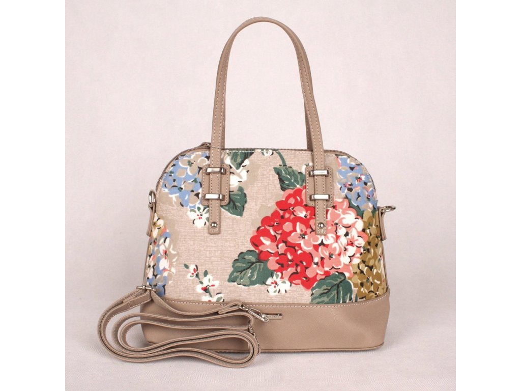 Kouzelná, jemně působící kabelka do ruky s krásným květinovým motivem na přední straně je středně velká.