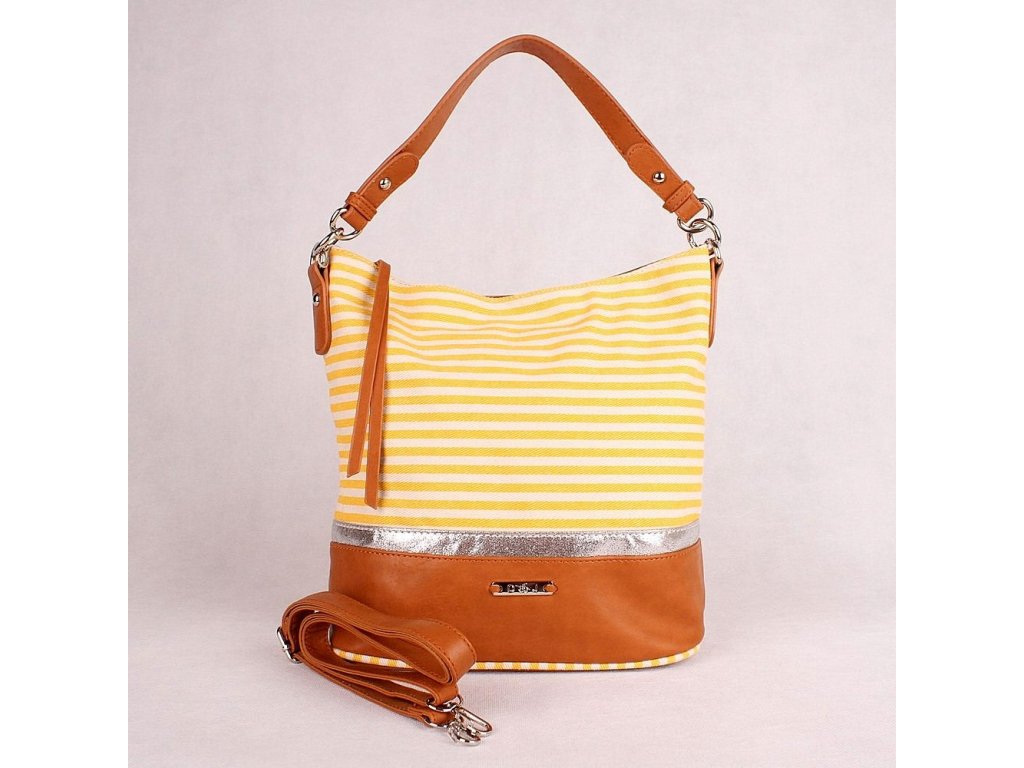 Středně velká kabelka na rameno 6284-2A o rozměrech 29 x 27,5 x 13 cm je pruhovaná v barevné kombinaci žluto-bílo-hnědé