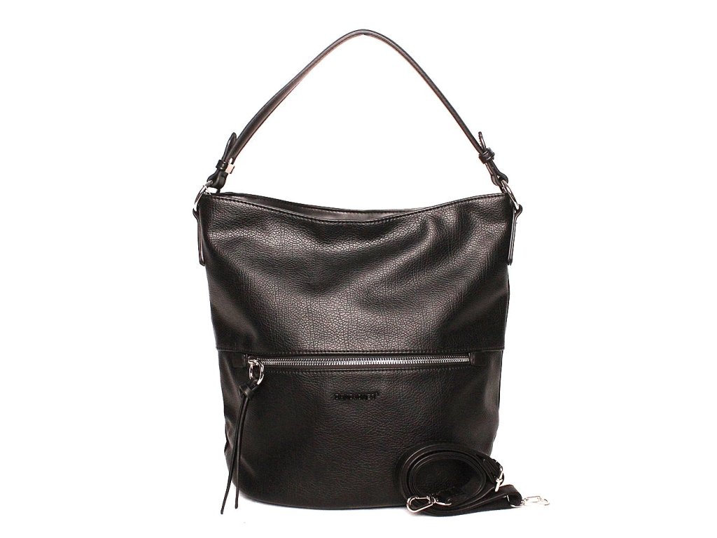 Přední strana této černé kabelky zaujme podélnou zipovou kapsou s ozdobnou třásní na jezdci zipu. Kabelka působí elegantně, sportovně a sexy.