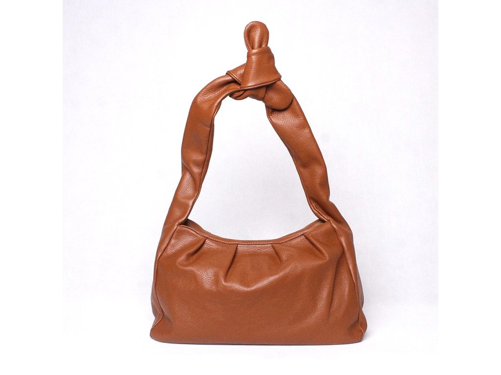 Hnědá kožená kabelka na rameno o rozměrech 38 x 23 x 12 cm s originálním provedením ucha, které je tvořeno sukem.