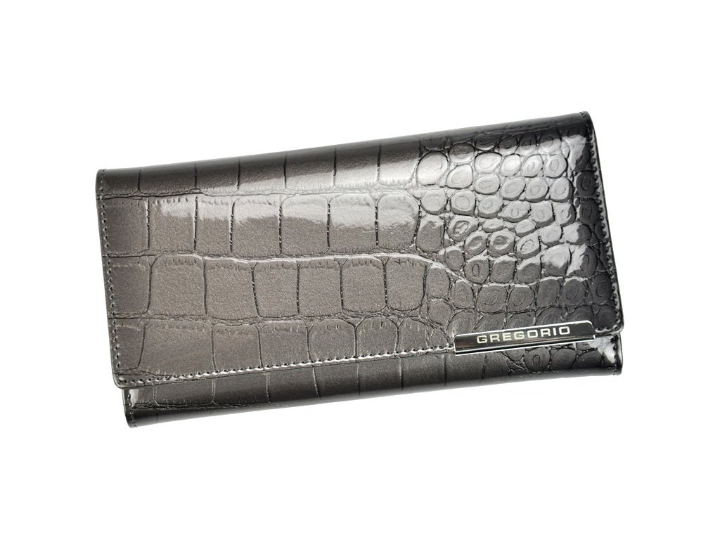 Šedá, kožená, lesklá, prostorná, s motivem hadí kůže, s kapsou na patentek i naklip - to vše a mnohem víc je peněženka značky Gregorio.