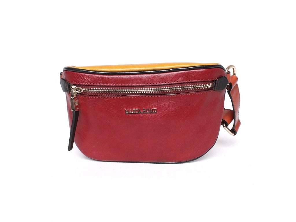 - značková ledvinka Marta Ponti v kombinací pestrých barev - přední část ledvinky je tmavěčervená, zadní tmavěmodrá, horní část je tmavěžlutá a popruh je vyveden v hnědé barvě