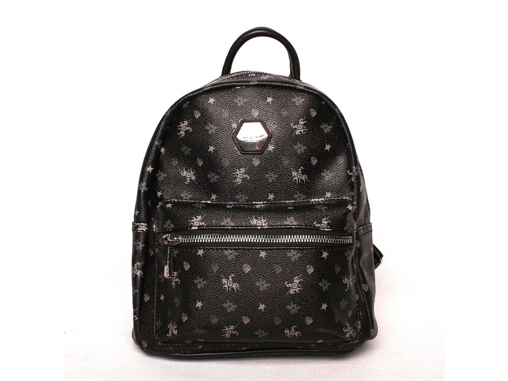 Kouzelný městský malý batůžek v černé barvě s různými ornamenty a symbolem jezdce na koni je určený pro ženy, které se nebojí být originální.