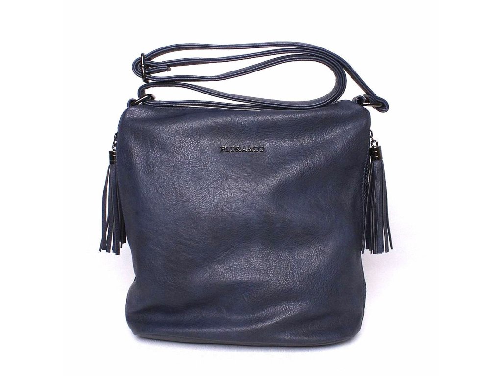 Jednoduchost, originalita, oblíbenost, dlouhý popruh, dostatečná velikost, ozdobné střapce to vše je crossbody kabelka značky FLORA&CO H7150 v tmavěmodré barvě.