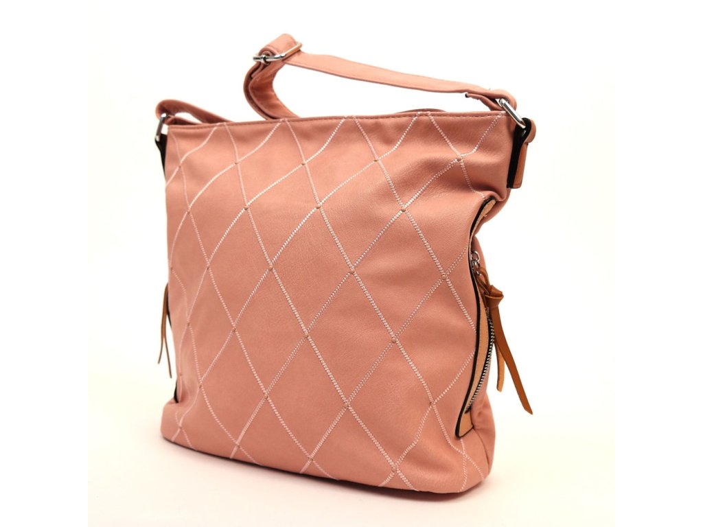 Středně velká crossbody v růžové barevném provedení je vzhledově zajímavá svým prošívaným vzorem i hnědými doplňky.