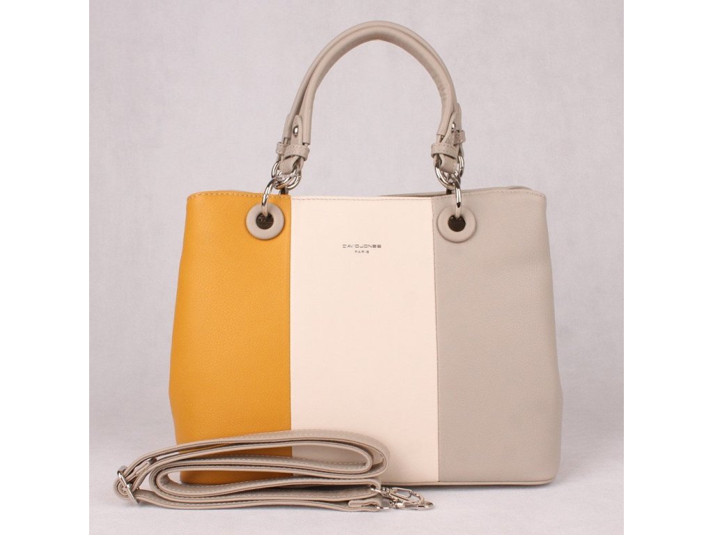 - na první pohled zaujme tříbarevnou kombinací na čelní straně (žluto-béžovo-šedá), ostatní části kabelky jsou šedé
