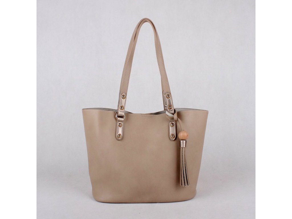 Moderní kabelka na rameno David Jones vyrobená z kvalitní pevné ekokůže ve stylu 2v1 (kabelka a etue). Kabelka má dvě ucha o výšce 26 cm, lze jí tedy pohodlně nosit na rameni. Přechod uch na kabelku je proveden v šedostříbrné barvě. Uvnitř kabelky je samostatná vyndavací látková etue (další kabelka) o rozměrech 35 x 18 x 13 cm, která se uzavírá na zip. Hlavní kabelka se uzavírá pouze na druk, uvnitř není žádná boční kapsička. Na jednom uchu je zavěšena třáseň s dřevěnou kuličkou. Kabelka je velmi prostorná, vejde se do ní formát A4. Doplňky jsou zlaté barvy. Dno je vystuženo.