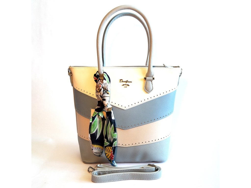 Kabelka David Jones 5926-4 ve světlemodré barvě ozvláštněna šátkem uvázaným na uchu kabelky.