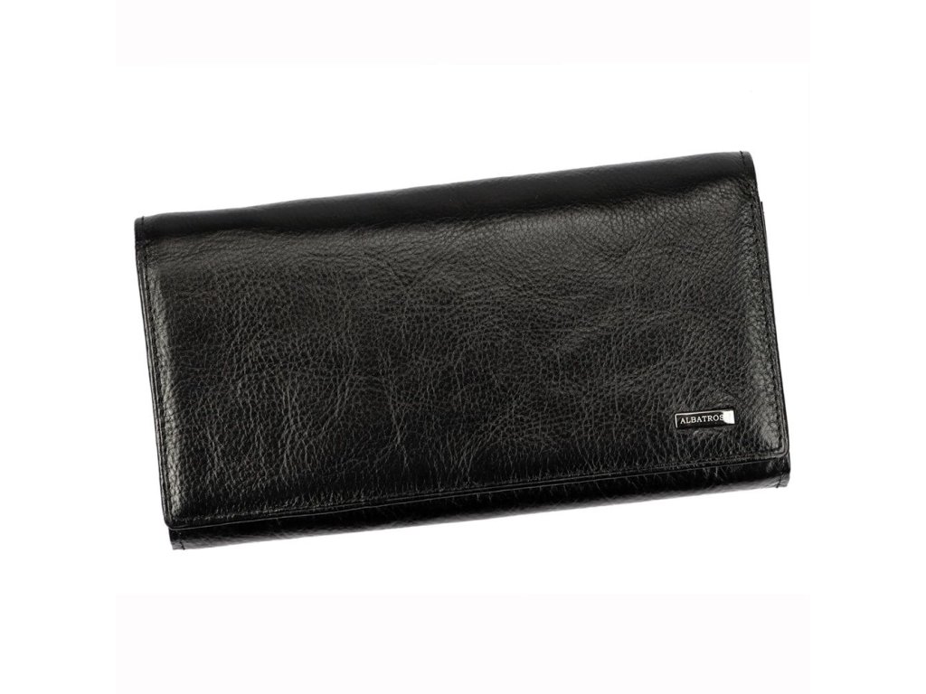 Kožená dámská pevná černá peněženka značky Albatross o rozměrech 18 x 9,5 cm s tmavěocelovou aplikací s logem na čelní straně peněženky
