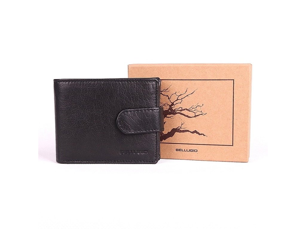 Černá kožená peněženka orientovaná podélně s vyraženým logem Bellugio na přední straně.