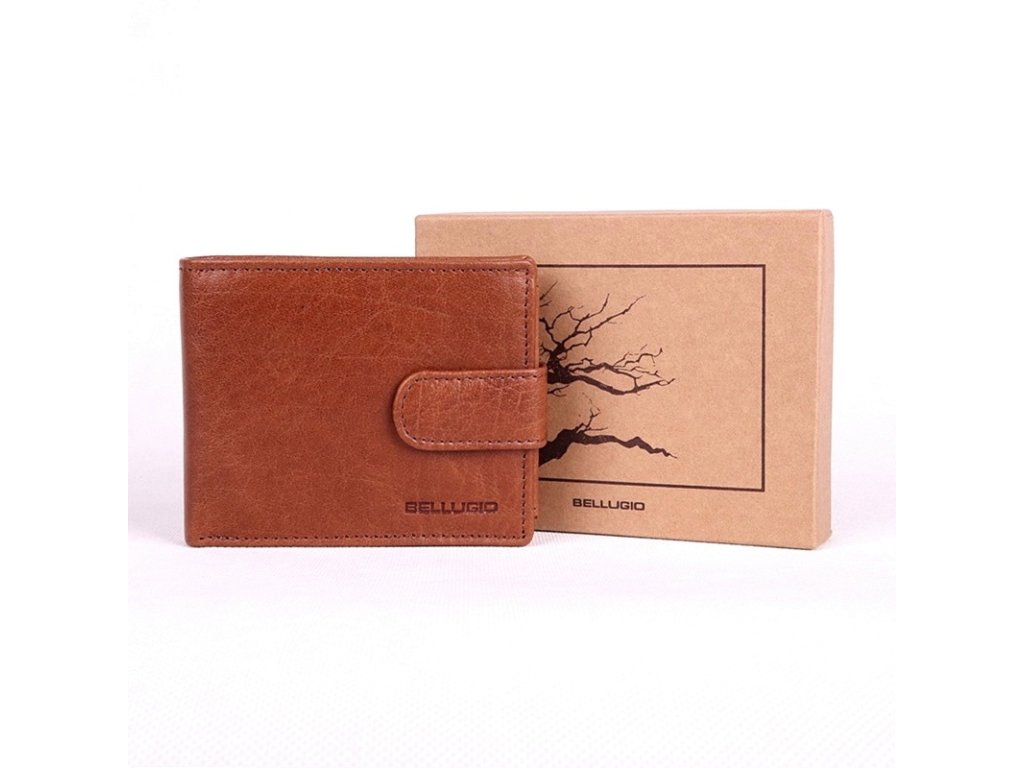 Hnědá kožená peněženka orientovaná podélně s vyraženým logem Bellugio na přední straně.