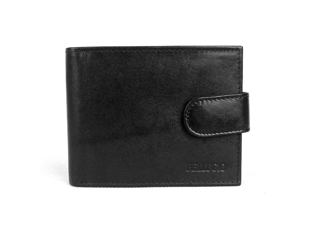 Černá kožená peněženka je orientovaná podélně s vyraženým logem Bellugio na přední straně.
