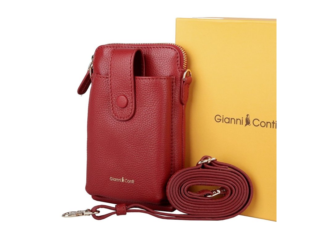 Malá dvouoddílová značková crossbody Gianni Conti v červené barvě, která je z přední části pouzdrem na mobil a v zadní malou kabelkou se sloty na karty či doklady.