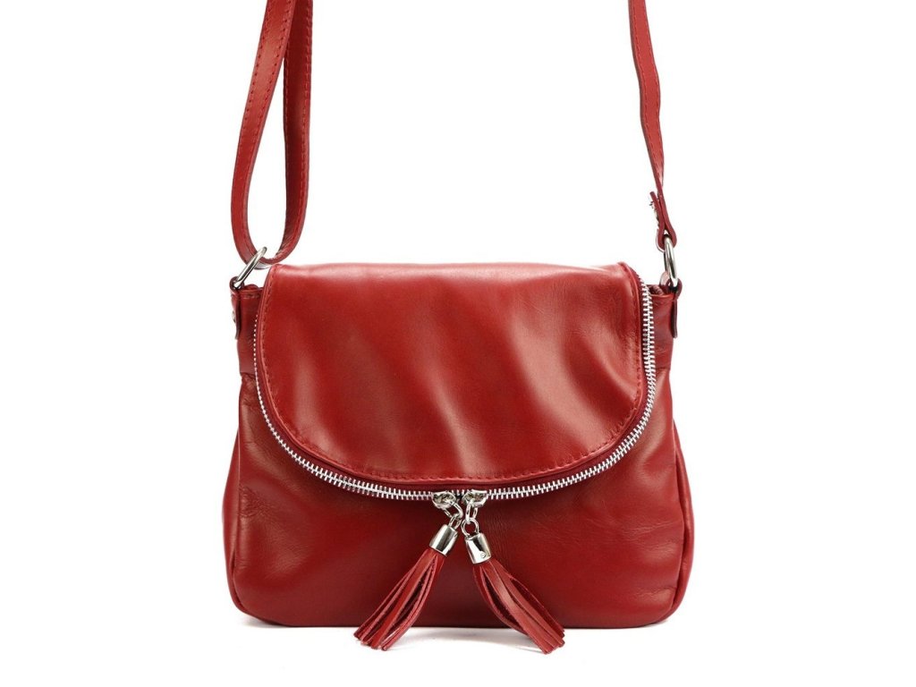 Oblíbený typ malé červené crossbody kabelky Luka s výraznými stříbrnými zipy s třásněmi na čelní straně.