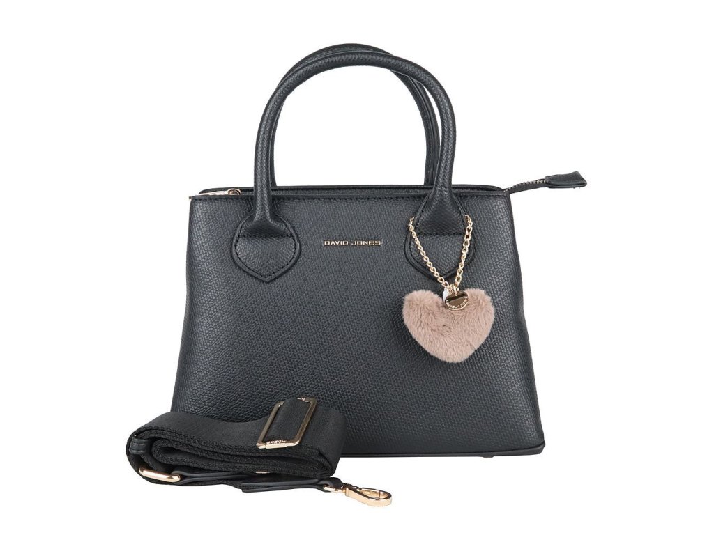 Elegantní černá kabelka do ruky značky David Jones s originální ozdobou ve tvaru srdce na uchu kabelky.