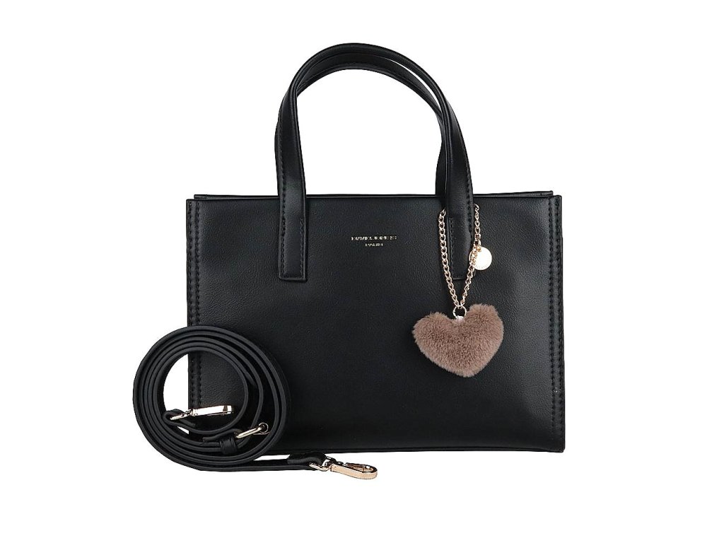 Elegantní černá kabelka do ruky značky David Jones s originální ozdobou ve tvaru srdce na uchu kabelky.