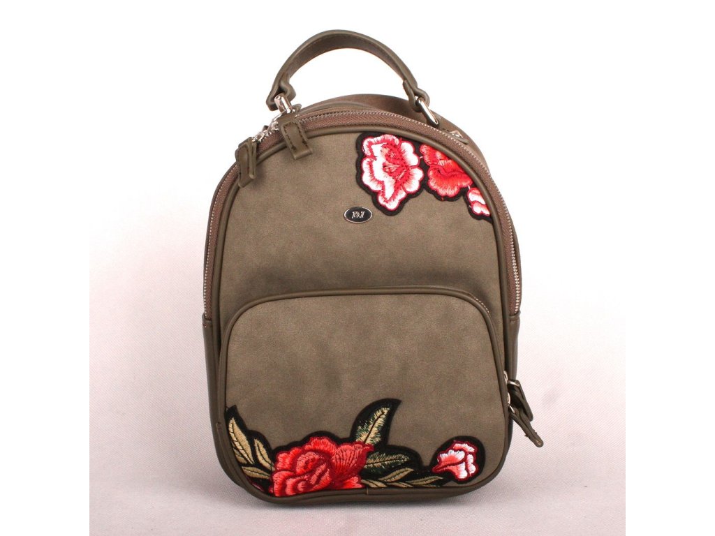 Kouzelný městský batůžek David Jones, jehož přední strana je vyzdobena vyšívaným motivem květin o rozměrech 19 x 25,5 x 14 cm v zelenohnědé (khaki) barvě.