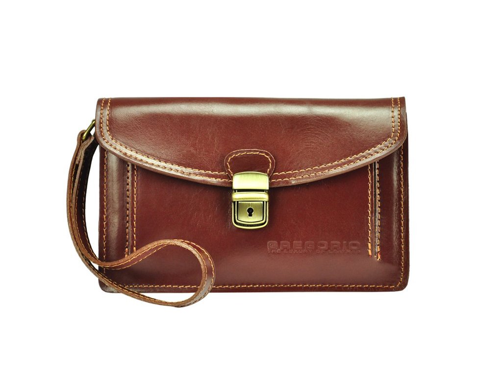 Značková etue do ruky/na zápěstí Gregorio je vyrobena z pevné kůže v hnědé barvě.