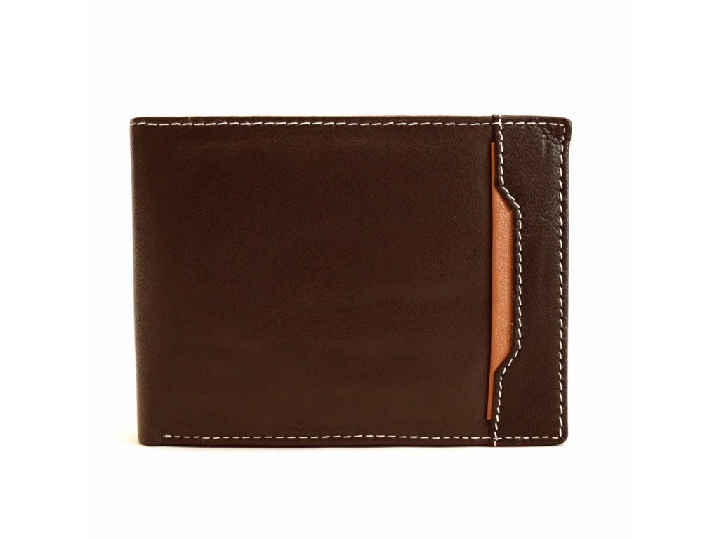 Tmavěhnědá (čokoládová) matná pánská kožená peněženka o rozměrech 11,9 x 9,1 cm, jejíž přední stranu zdobí svislý světlehnědý proužek kůže.