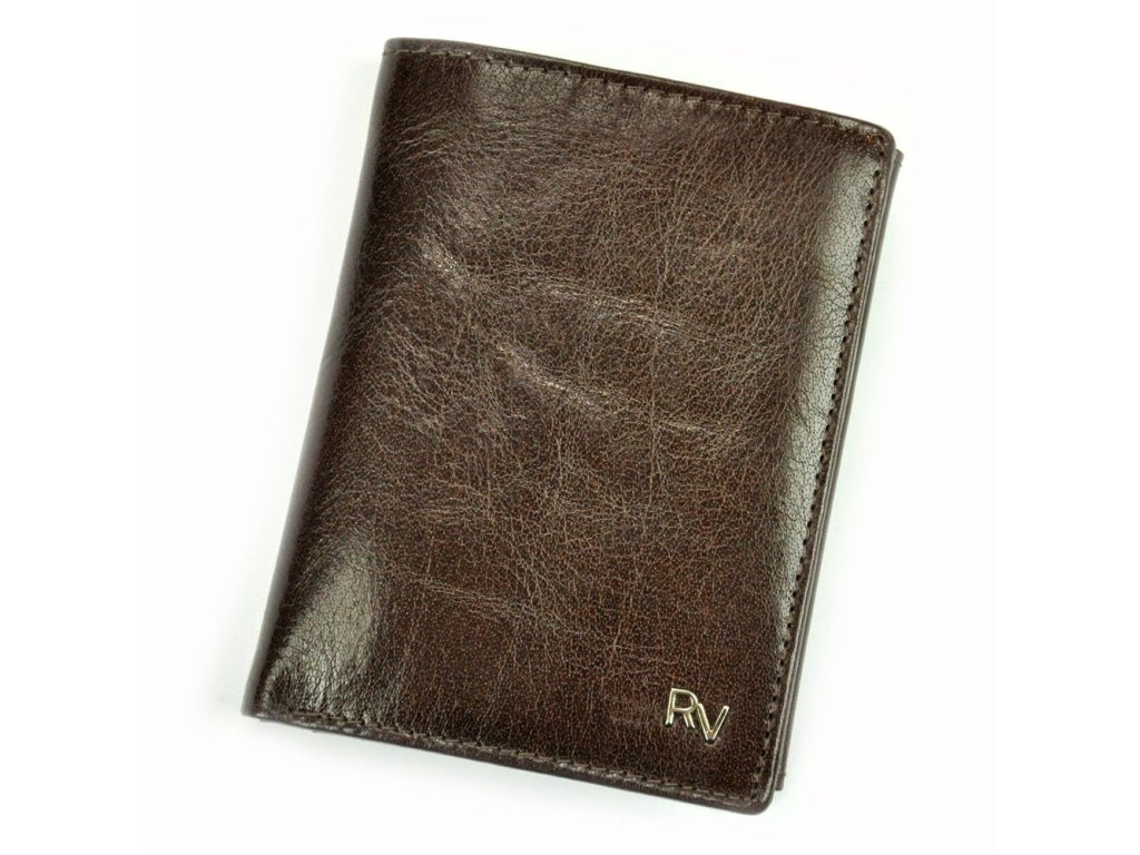 Hnědá kožená pánská peněženka bez uzavírání od známé značky Rovicky se stříbrným logem RV na čelní straně je novinka, která nezklame.