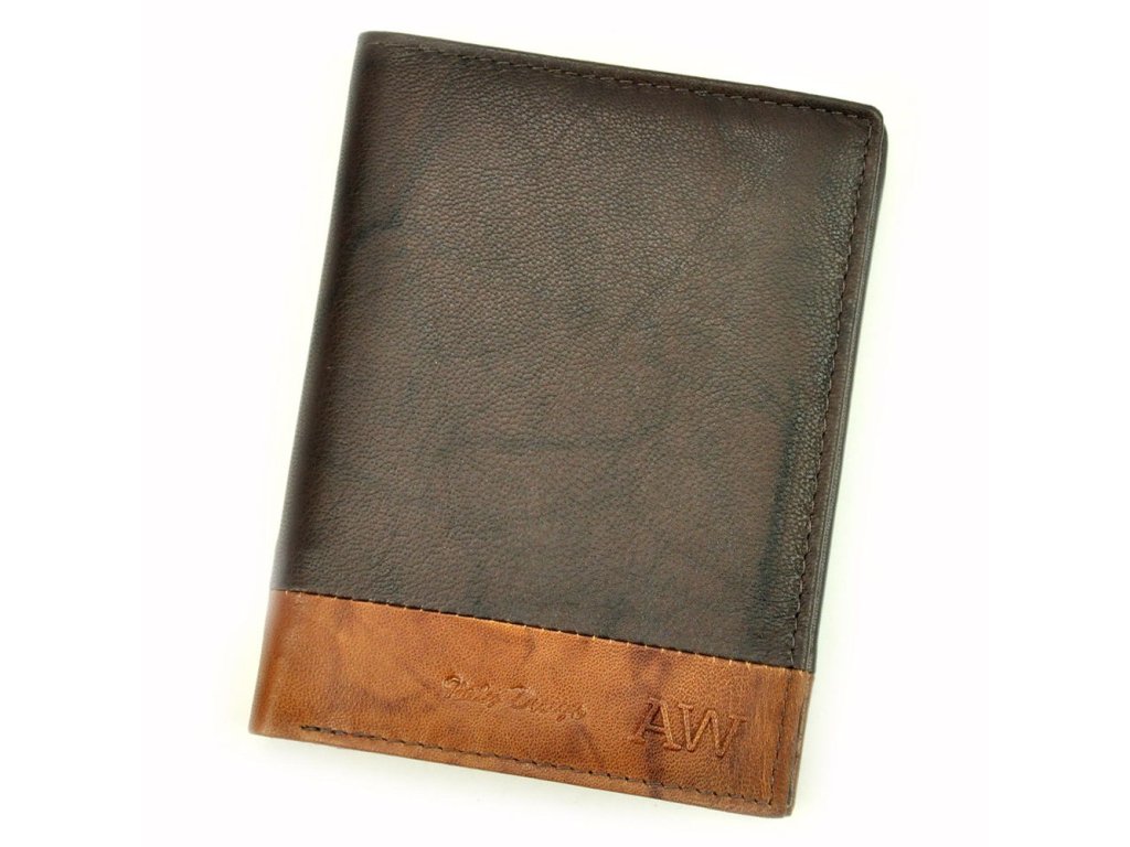 - kvalitní pánská kožená peněženka se zajímavou barevnou kombinací vnější strany peněženky, s vyraženým nápisem Italy Desing a logem AW na čelní straně