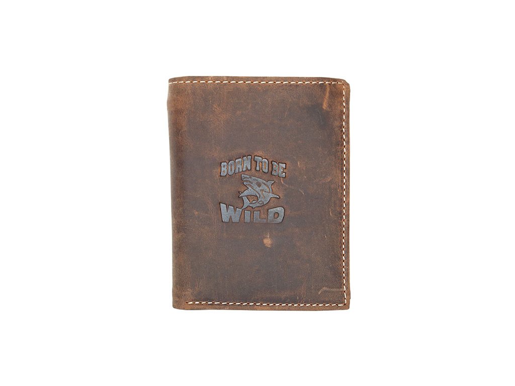 Kožená peněženka značky Born to be Wild z pevné odolné kúže o rozměrech 9,6 x 12,2 cm s vyraženým žralokem na přední straně. Peněženka je orientována na výšku. Občanský či technický průkaz se vejdou.