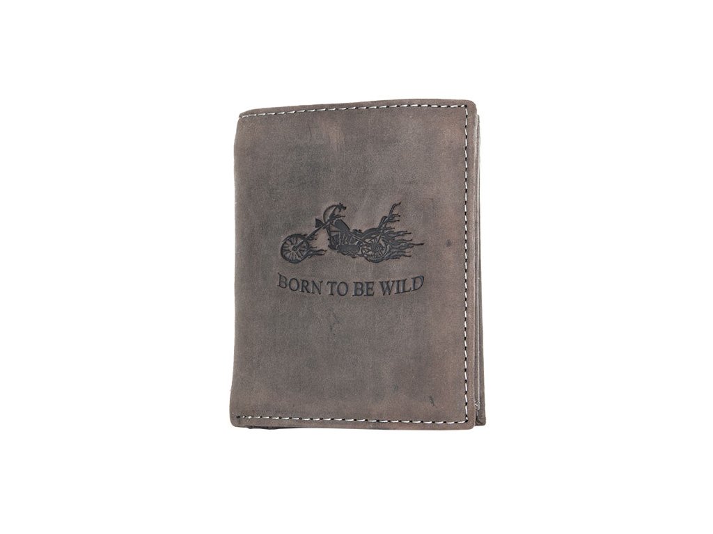 Kožená šedohnědá peněženka značky Born to be Wild z pevné odolné kúže o rozměrech 9,6 x 12,2 cm s vyraženou motorkou na přední straně. Peněženka je orientována na výšku. Občanský či technický průkaz se vejdou.