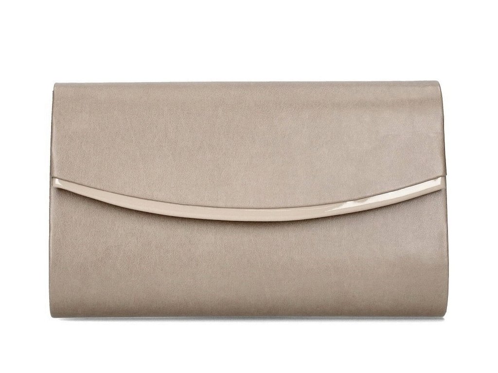 Elegantní pevné psaníčko v matně béžovo-hnědé barvě s lesklým proužkem podél spodní hrany klopy je oblíbeným doplňkem a doprovodí ženu nejen do společnosti.