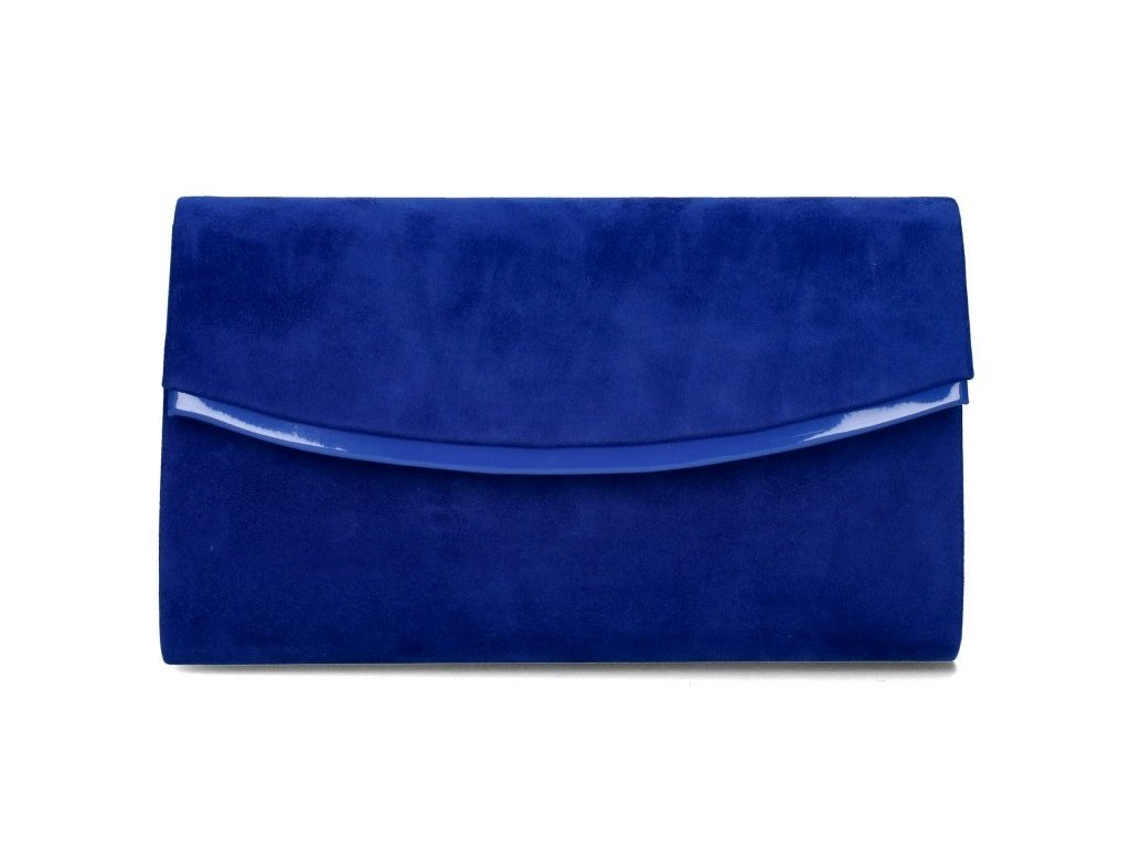 Elegantní semišové pevné psaníčko v modré barvě s lesklým proužkem podél spodní hrany klopy je oblíbeným doplňkem a doprovodí ženu nejen do společnosti.