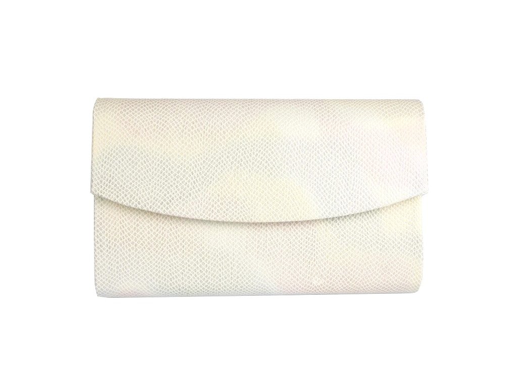 Velmi originální bílo-béžové pevné psaníčko s duhovým třpytivým efektem je výrazným doplňkem, který ženu doprovodí kamkoliv.