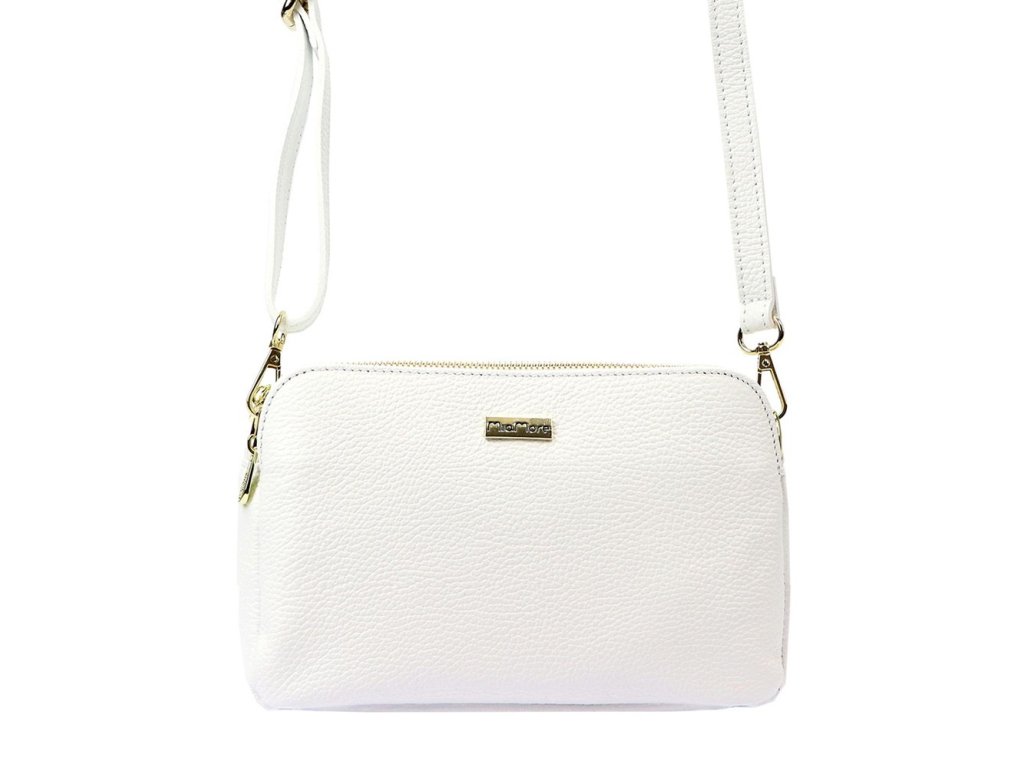 Malá kožená crossbody kabelka značky Mia More v bílé barvě, která je rozdělena na tři oddíly.
