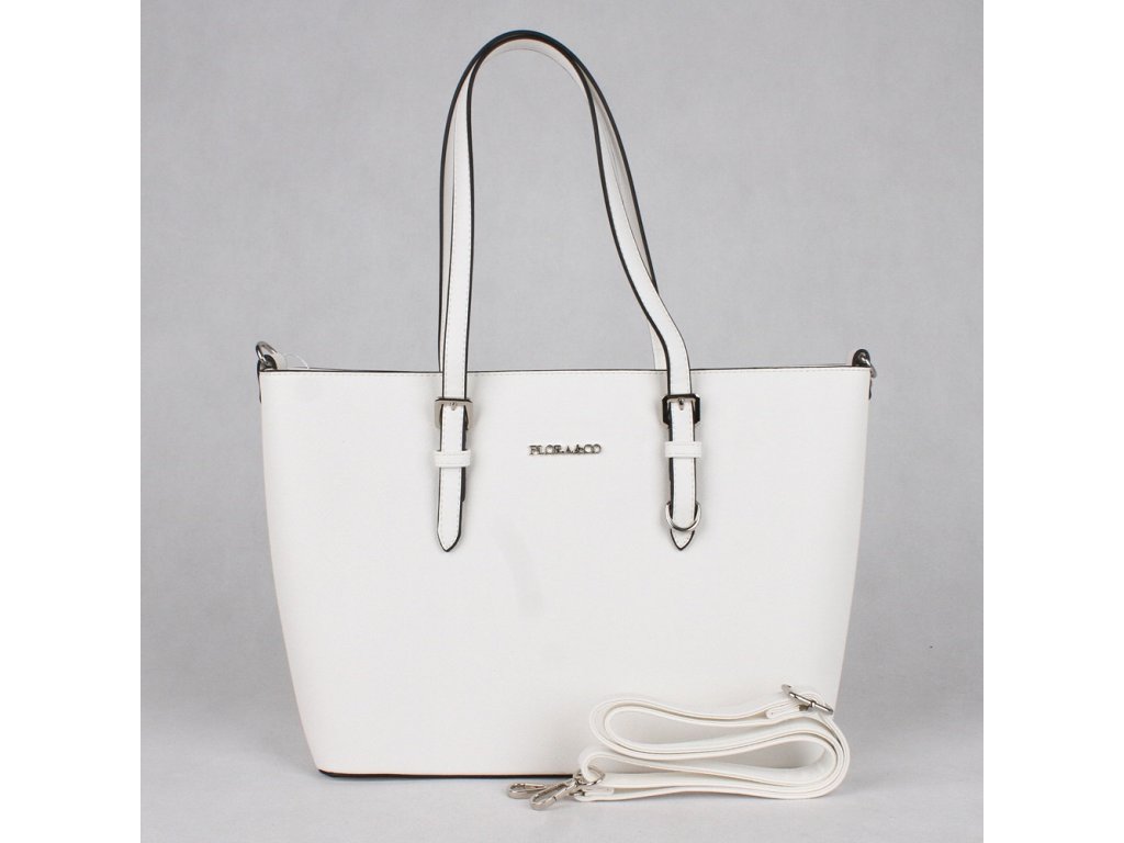 Pevná velká elegantní kabelka bílé barvy do ruky i na rameno značky FLORA&CO se stříbrnými doplňky.